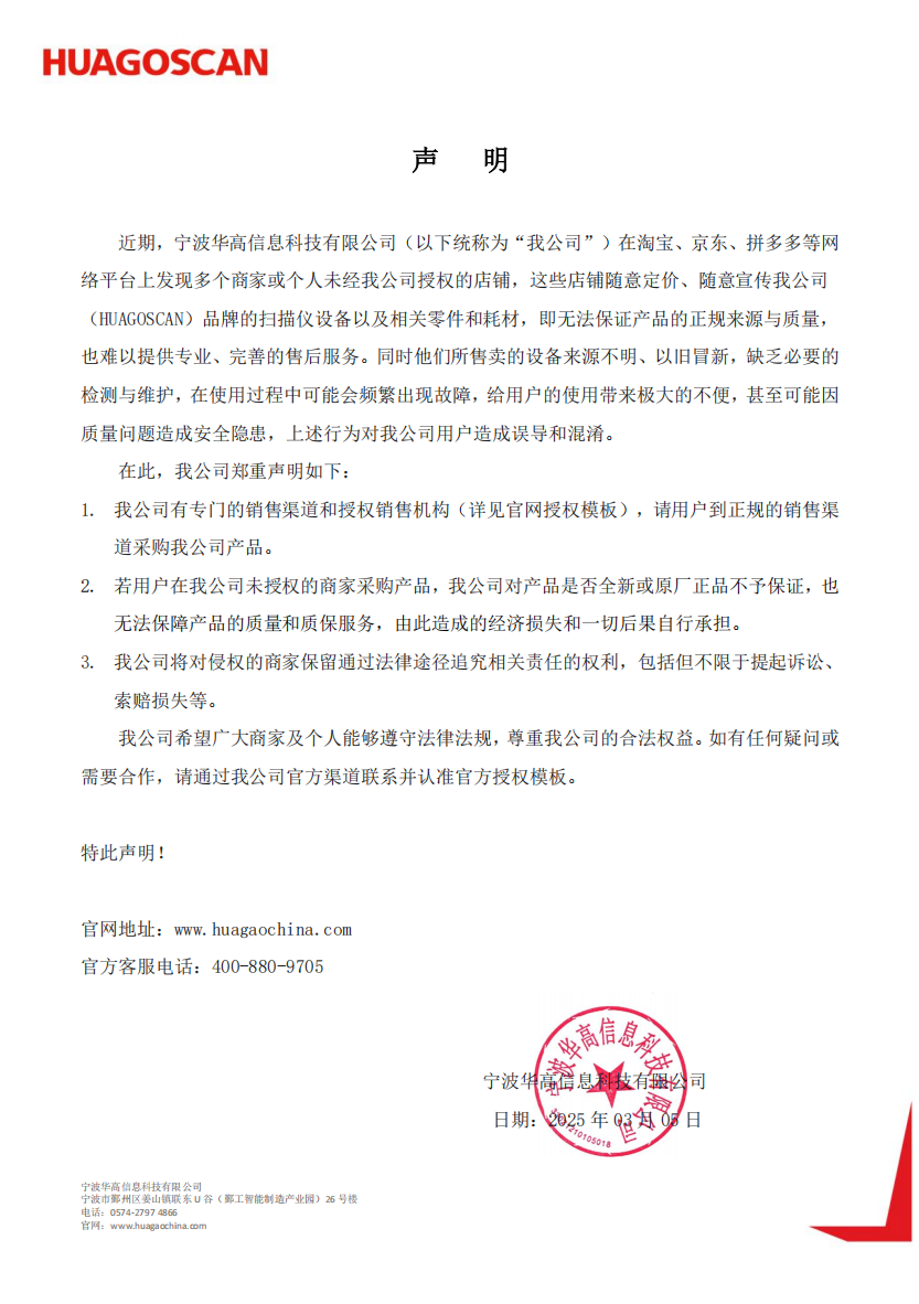 近期,寧波華高信息科技有限公司(以下統稱為“我公司”)在淘寶、京東、拼多多等網絡平臺上發現多個商家或個人未經我公司授權的店鋪,這些店鋪隨意定價、隨意宣傳我公司(HUAGOSCAN)品牌的掃描儀設備以及相關零件和耗材,即無法保證產品的正規來源與質量,也難以提供專業、完善的售后服務。同時他們所售賣的設備來源不明、以舊冒新,缺乏必要的檢測與維護,在使用過程中可能會頻繁出現故障,給用戶的使用帶來極大的不便,甚至可能因質量問題造成安全隱患,上述行為對我公司用戶造成誤導和混淆。